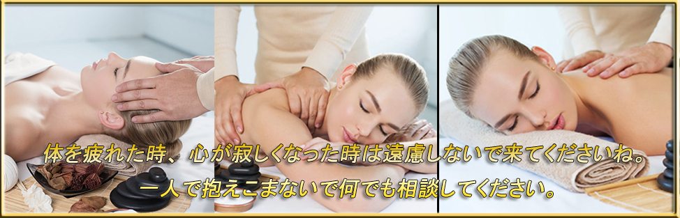 当店では、アロマオイルの効能と当店自慢のセラピストによるリンパマッサージの相乗効果による、癒しのひとときをお客様お一人お一人にお届けしております、自然で心やすらぐ優美な香りを、施術中はもちろんご帰宅お休みになってから翌日朝目覚めでまで楽しんで頂けます、どうぞゆっくりご堪能ください。